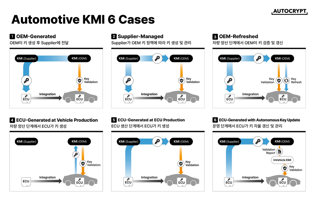 그렇다면 이러한 자동차 보안 키 관리 인프라는 실제 환경에서 어떻게 활용될까요? Autocrypt 에서는 자동차 환경의 특수성을 고려하여, 이 인프라 체계를 실무에 적용한 Automotive KMI(Key Management Infrastructure) 솔루션의 핵심 케이스를 다음과 같이 6가지 모델로 정의하고 있습니다.