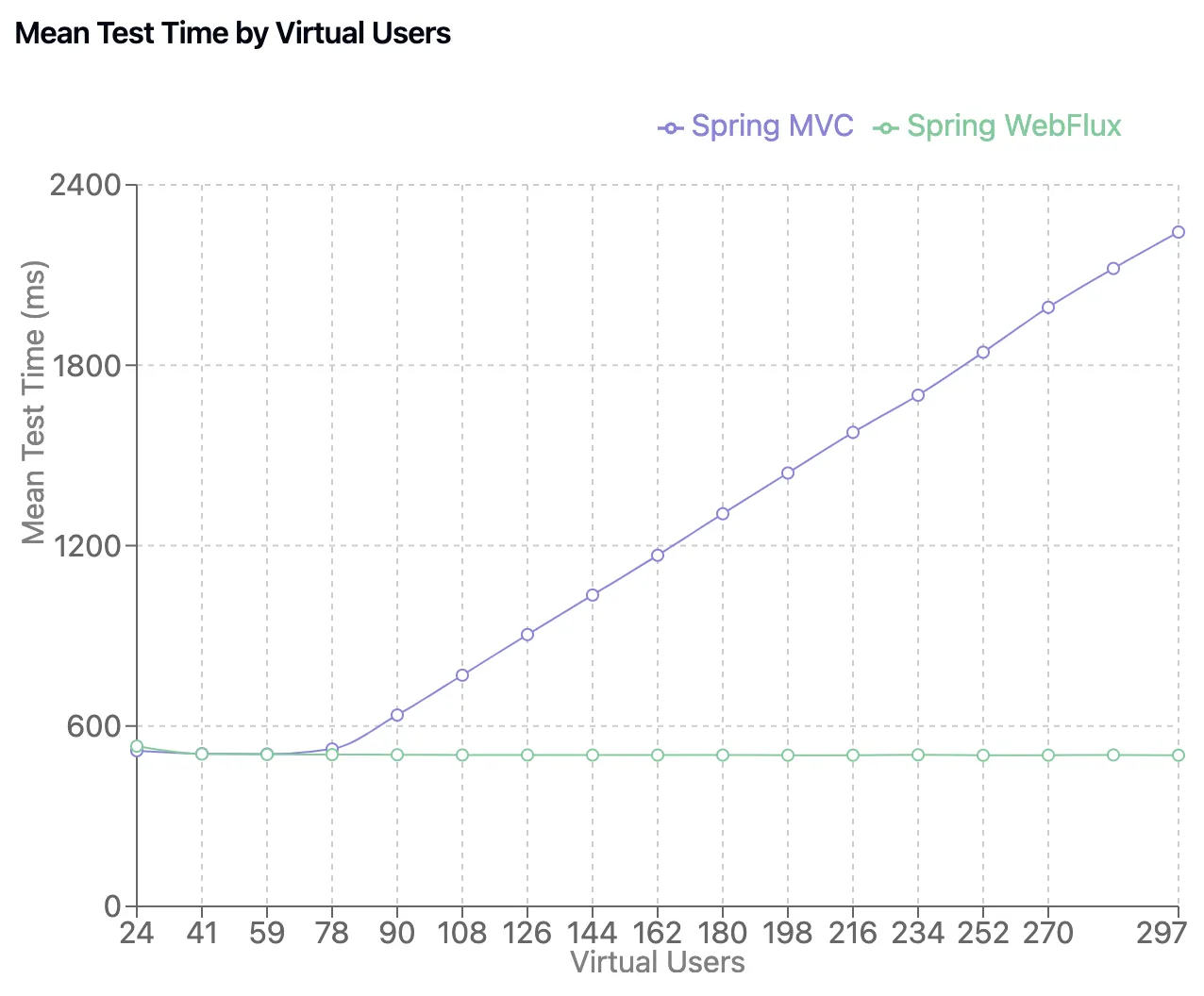 간단한 성능 비교를 위해 동일한 기능을 하는 두 서버를 각각 MVC와 Webflux를 사용하여 구성하고 300명의 가상 유저가 요청을 보내는 방식으로 성능 테스트를 진행했습니다.