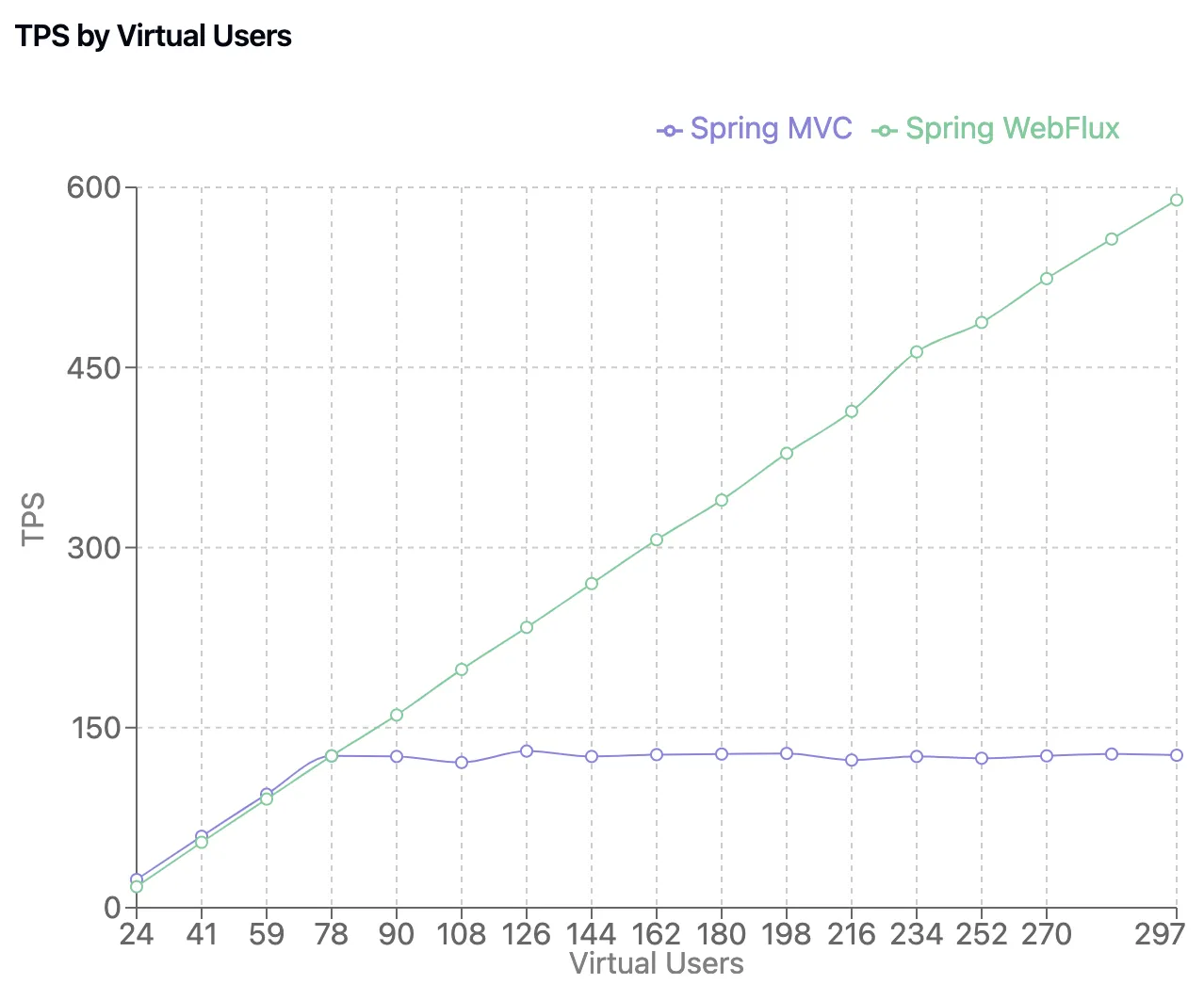 그 결과 TPS(초당 요청 처리 개수)의 경우 MVC는 최대 120, WebFlux는 최대 600 이상으로 나타나며, WebFlux가 MVC에 비해 높은 성능을 나타내는걸 확인할 수 있었습니다.