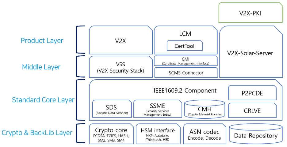 - OBU(On-Board Unit)와 RSU(Road Side Unit) 간 BSM(Basic Safety Message) 등 보안 통신을 위한 암호화, 전자서명 제공