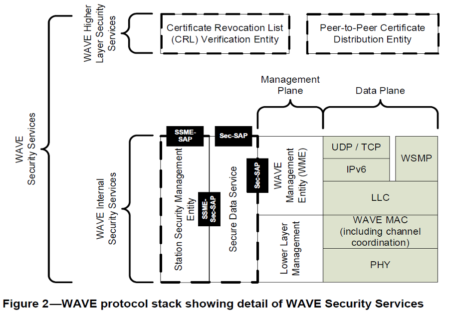 인증서 교체 및 BSM등 주요 메시지 프로파일과 같은 IEEE 1609.2의 범위를 벗어나는 기능에 대해서는 SAE J2945/1[5] 표준에 추가적으로 정의된 내용들이 있습니다.